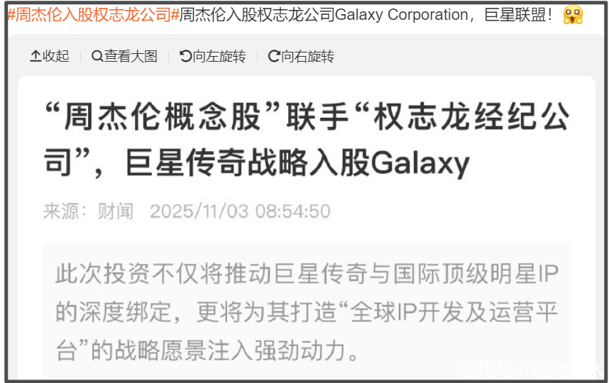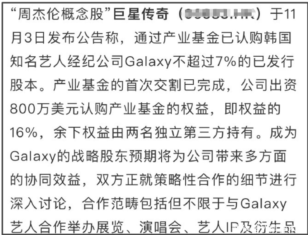 原来“周杰伦入股权志龙”又是典型文字游戏,严格说,是手持周杰伦概念股的巨星传奇入股了权志龙经纪公司,相当于IP合作,目前还不涉及本人合作。