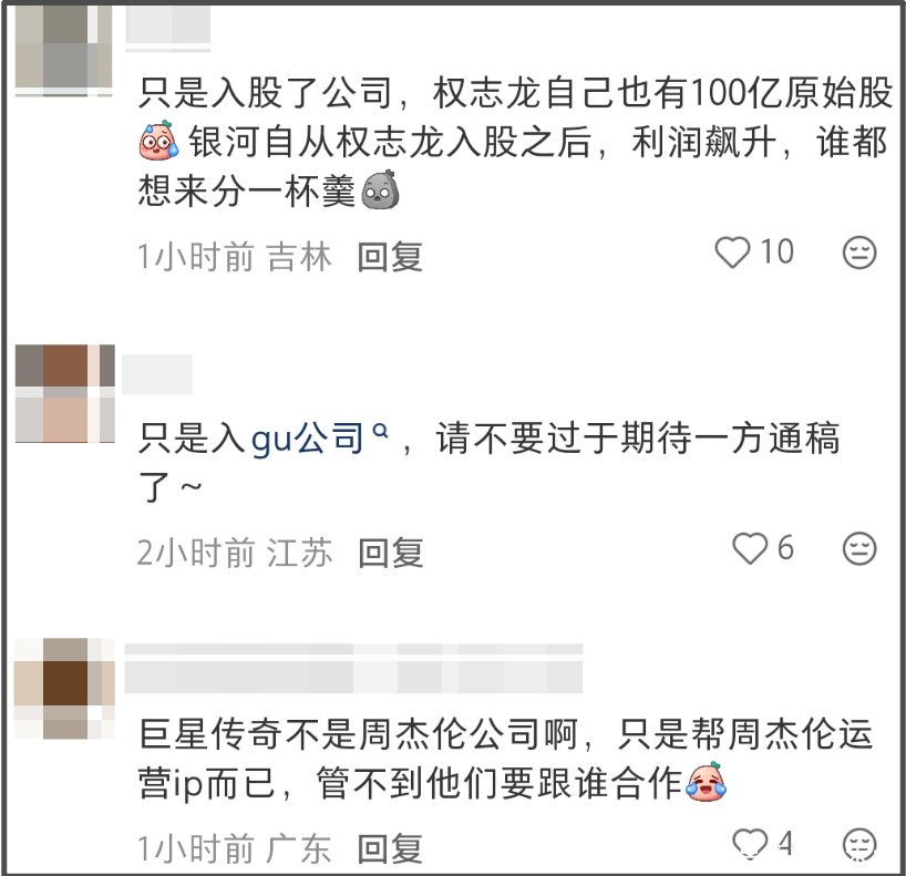 另外,还有网友提到,周杰伦、权志龙IP合作存在隐患,因为权志龙和经纪公司合作并不算愉快,一直有解约传闻,倘若巨星传奇是冲着权志龙去的,很有可能竹篮打水一场空。